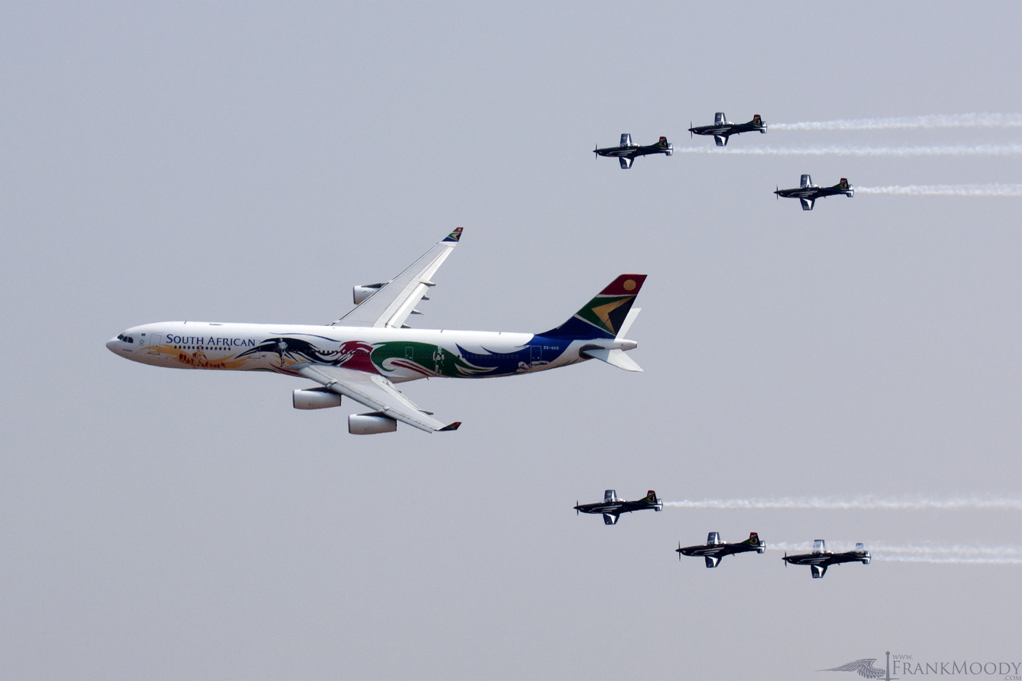 Silver Falcons of the South African Airforce formate with SAA A340.
